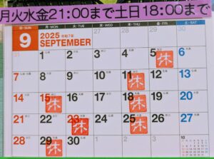 9月は休業日が少々変則的となりますお間違いなきようよろしくお願いいたします※日曜も受付けております